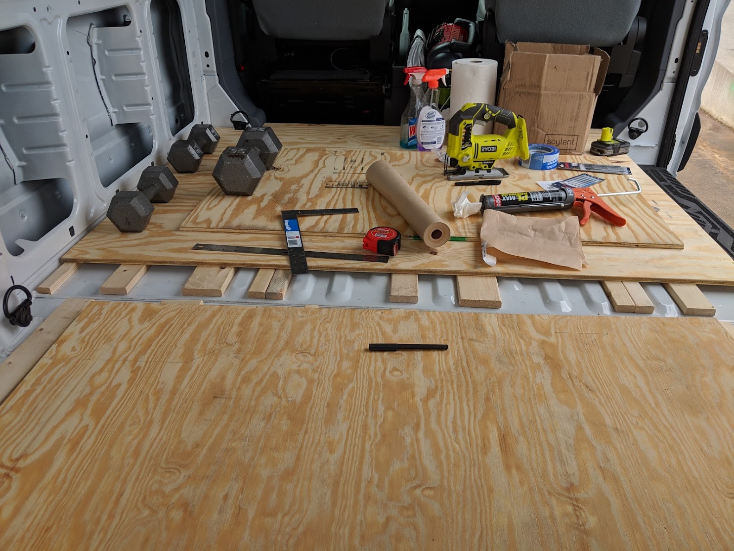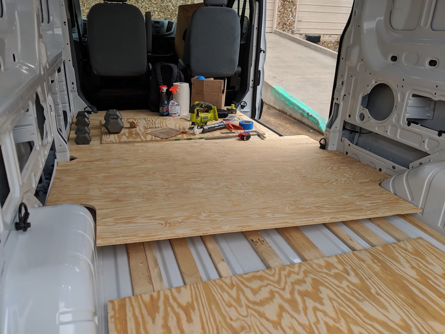 Wooden slats were adhered using Loctite Construction Adhesive to the floor of the van