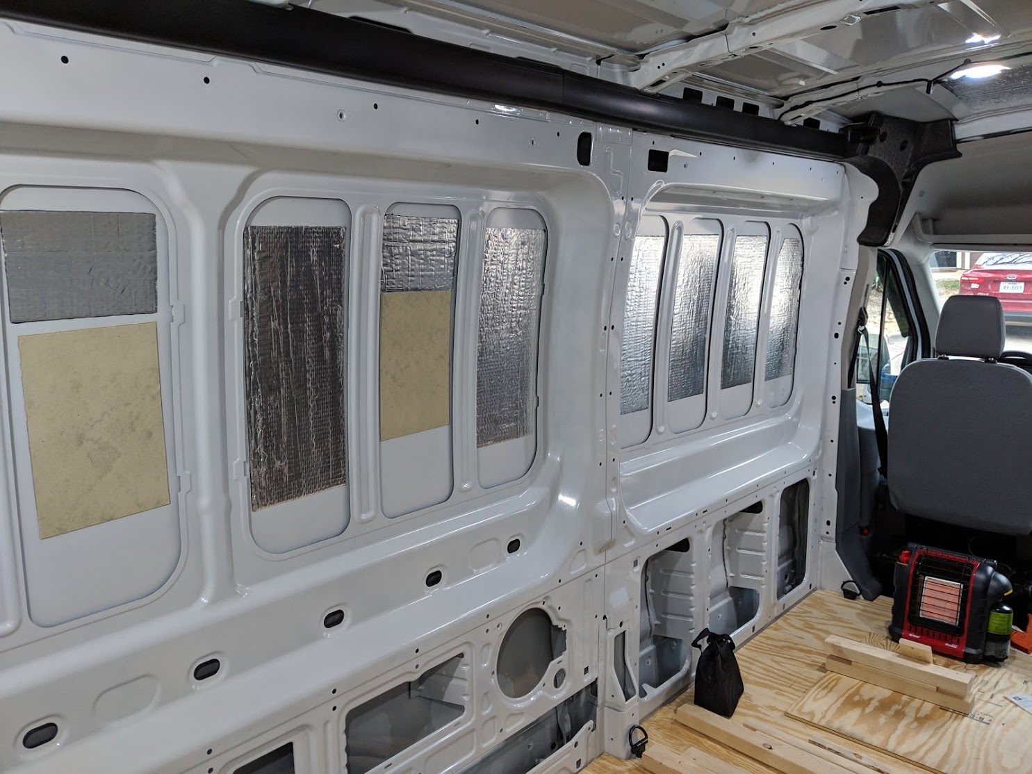 Butyl Automotive Sound Deadener was heated to spec and pressed into exposed areas of the van walls