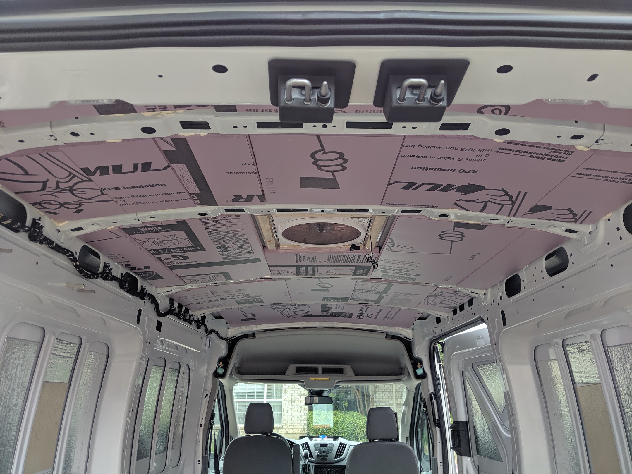 XPS foam insulation was initially installed on the ceiling using foam board adhesive and foam sealant on adjacent sides of the foam board. Reason being to avoid an airtight foam board installation; allowing the gaps between the board and sheet metal to breath. This is counter-intuitive to insulation but I was afraid of moisture being trapped within these gaps resulting in the inevitable growth of mold. I ended up removing a couple panels next to the ceiling fan while diagnosing a squeak and left the remaining panels in. The squeak was from vibrations in the fan, which I ended up dampening by reinforcing underneath the fan with wooden slats.