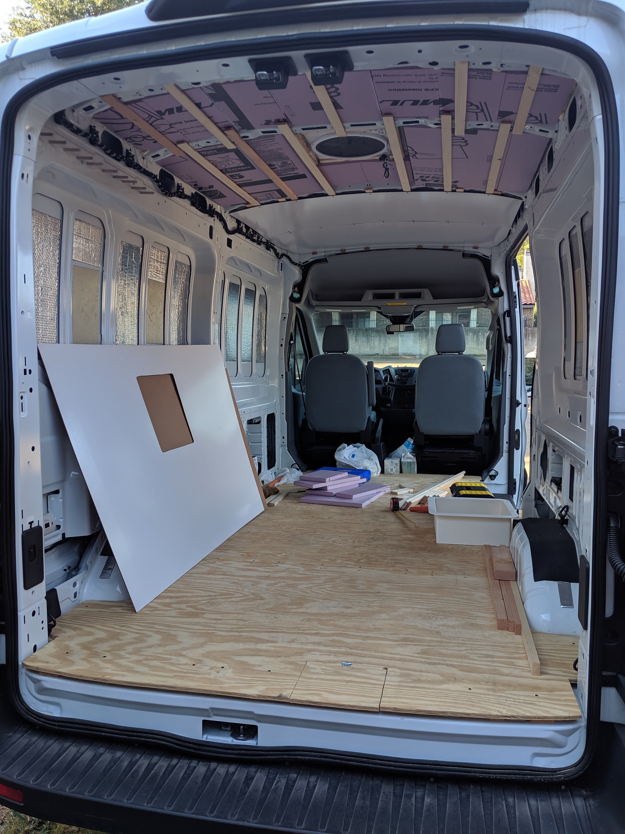 In order to maximize vertical space, 0.5” slats were cut from lumber using a table saw and adhered with construction adhesive to the ceiling ribs. White hardboard similar to this was cut to fit and screwed into the slats. The adhesion is very strong and was capable of supporting weight > 50 lbs next to the ribs. However my greatest regret is not waiting to find a transit with the high roof instead of medium roof, high roof was very scarce at the time of purchase.