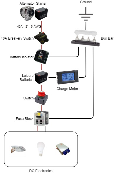 The auxiliary battery is charged by the alternator through the Ford CCP (Customer Connection Point). Between the CCP is a 40 AMP Circuit Breaker and a Battery Isolator. Another switch is placed between the auxiliary battery and the Fuse Block. Two Bus Bars support the negative and positive connections. An LCD Voltmeter Display allows us to monitor the health of the auxiliary battery.